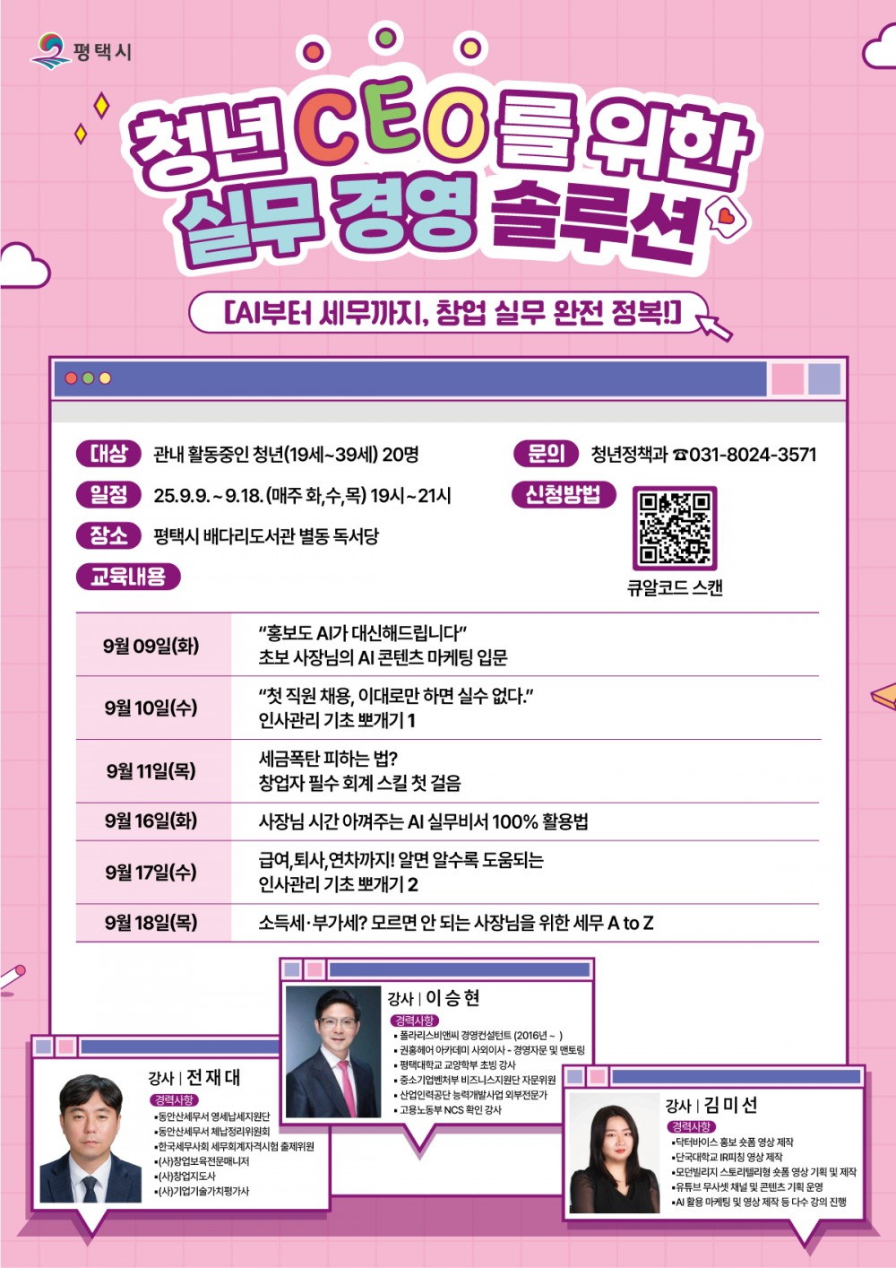 교육 과정은 총 6일 동안 진행되며, 각 분야의 전문가들이 강사로 나서 ▲AI 콘텐츠 마케팅 ▲인사․경영관리 ▲청년 창업자를 위한 기초 세무 및 회계 교육 등을 심도 있게 다룰 예정이다.