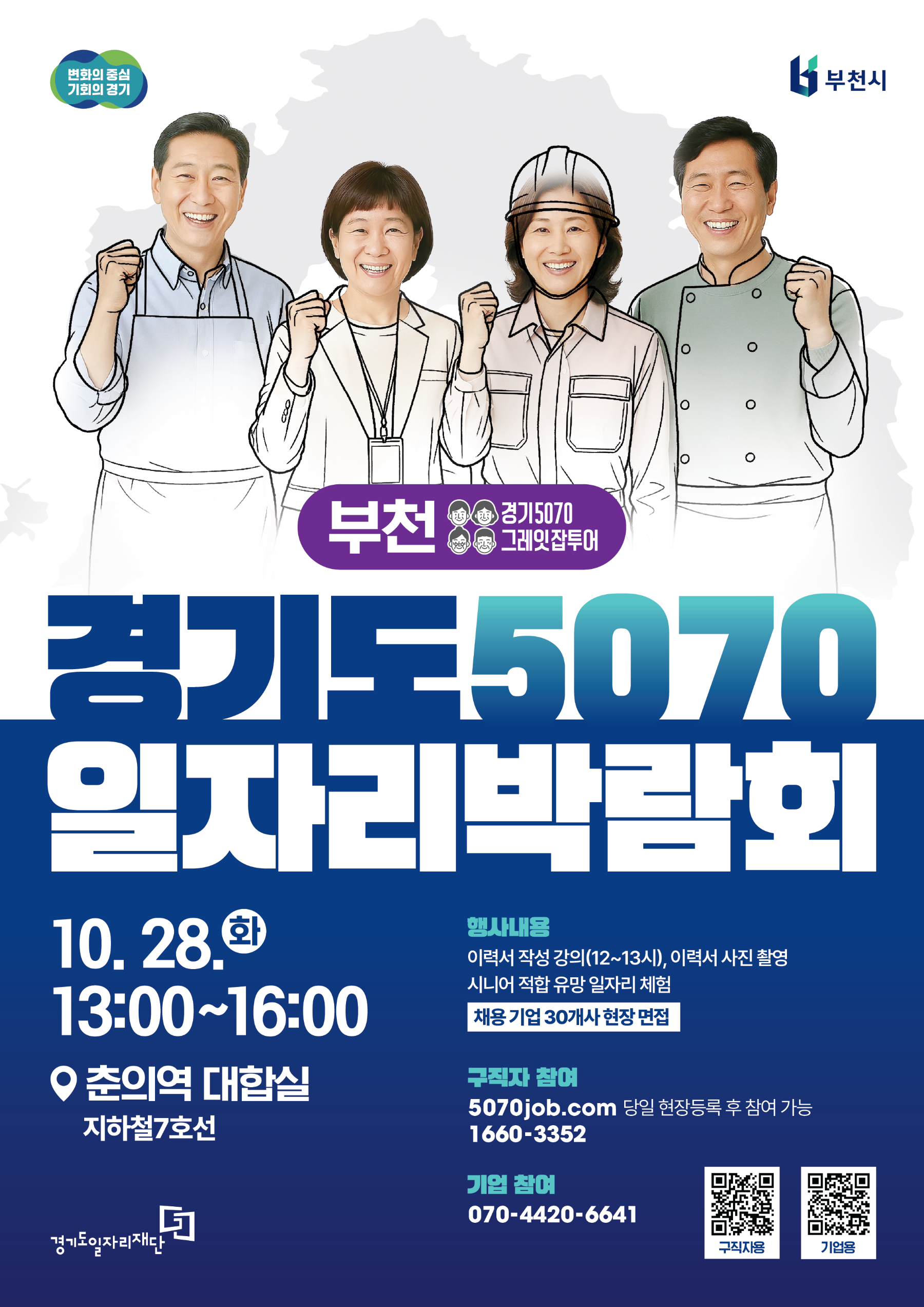 ‘경기도 5070 일자리박람회’는 중장년층을 위한 재취업 지원 행사로, 중장년 구직 수요에 대응하고 상시 채용 환경을 조성하는 데 중점을 둔다. 이번 부천 박람회는 ‘경기 5070 그레잇잡투어(Gray it-job tour)’의 일환으로 진행된다. ‘그레잇잡투어’는 중장년을 뜻하는 ‘Gray’와 시군 순회 일자리박람회를 의미하는 ‘it-job tour’를 결합한 명칭이다.